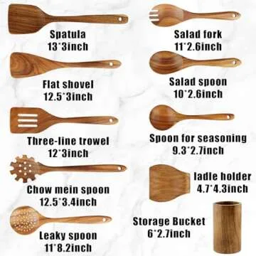 Show more Introduce a touch of elegance and functionality to your kitchen with the FJNATINH Wooden Spoons for Cooking, a meticulously crafted 10 Pcs Teak Wooden Cooking Utensil Set. This comprehensive collection includes essential tools such as a flat spatula, fried spatula, slotted spatula, mixing spoon, salad fork, salad spoon, pasta spoon, and a convenient kitchen utensil holder. Each piece is thoughtfully designed to meet all your cooking needs while enhancing the aesthetic appeal of your kitchen. Constructed from high-quality teak wood, these utensils are durable, non-sticky, and safe for use on all types of cookware.