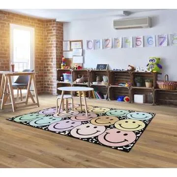 Flagship Carpets Schoolgirl Style Pastel Rainbow Smileys on Notebook Educational Area Rug for Kids Room Seating Décor, Children's Classroom, Play Carpet for Teaching and Playroom, 5' x 7'6", Multi