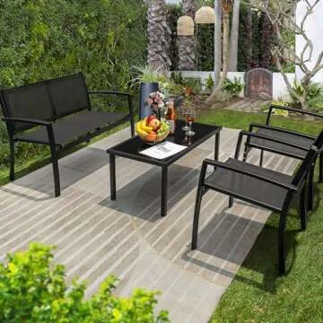 Show moreIntroducing the Flamaker 4 Pieces Outdoor Patio Furniture Textilene Modern Conversation Black Bistro Set, a standout choice for those looking to enhance their outdoor and indoor spaces with style and functionality. Crafted with a sturdy powder-coated steel frame, this set promises longevity and resilience, ensuring that it resists the wear and tear of outdoor conditions while maintaining its aesthetic appeal. The modern design is characterized by clean lines and a minimalist approach, making it a versatile addition to any home, lawn, or balcony. Lovingly woven with high-quality Textilene, the chairs offer breathability and comfort, making them perfect for casual lounging or gathering with friends and family. This set strikes a perfect balance between elegance and practicality, ensuring you enjoy moments of leisure in comfort and style.