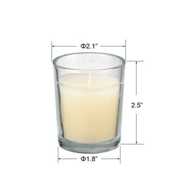 Show more Illuminate your spaces with our exquisite set of small votive candles, designed to add a touch of elegance and warmth to any occasion. Each candle measures 2.1 inches in diameter and 2.5 inches in height, making them the perfect fit for your candle lanterns, centerpieces, or as standalone decor on your mantel or table. With a generous package that includes 24 glass votive candles, you can enjoy an impressive burn time of up to 18 hours each.