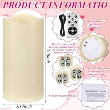 Show more This Valentine's Day Flameless Candle is the ultimate enhancement for your romantic decor, designed to envelop your space in a warm, inviting glow that creates a memorable atmosphere for you and your loved ones. Made with high-quality, durable plastic, it not only ensures safety by eliminating the risks associated with traditional candles, but also presents an aesthetically pleasing piece that elegantly complements your holiday setting. As you set the mood for romance, the candle features a unique color heart projection that captivates all who lay eyes on it. Upon lighting the candle, a stunning display of four rotating hearts is projected onto your ceiling, showcasing beautiful designs that change with the interchangeable film pieces included.