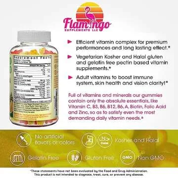 Show more Introducing the Flamingo Supplements Multivitamin Gummies – a delightful solution for your daily vitamin needs! Packed into each bottle are 100 tasty gummies that provide an essential blend of vitamins and minerals crucial for men, women, and children. Forget about choking down traditional vitamins; these gummies are not only nutritious but they also taste fantastic!
