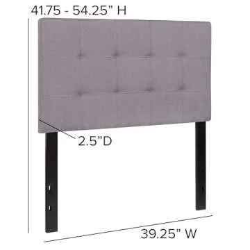 Show moreTransform your bedroom into a modern sanctuary with the Flash Furniture Bedford Tufted Upholstered Twin Size Headboard. This sophisticated headboard features a stylish light gray fabric upholstery that adds a touch of elegance to any decor. Measuring 39.25"W x 3"D x 24"H, it serves as a perfect complement to your bed, providing a seamless blend of comfort and chic design. The black metal stands come complete with adjustable bed rail slots, allowing for easy installation and customization to suit your bed frame requirements. This headboard isn’t just beautiful; it’s built to last, constructed from high-quality materials that promise durability and stability for years to come.
