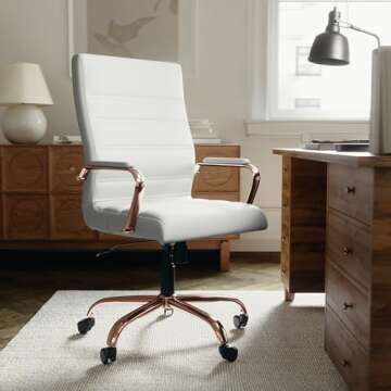 Show moreTransform your work environment with the elegant Flash Furniture Whitney High-Back Swivel LeatherSoft Desk Chair. This modern office chair combines sophisticated aesthetics with superior comfort, making it perfect for various settings, including offices, nail salons, car shops, and even college dorms. With its rich white LeatherSoft upholstery complemented by a stunning rose gold metal base, this chair not only enhances your workspace's visual appeal but also promotes a productive atmosphere where you can work comfortably for hours.