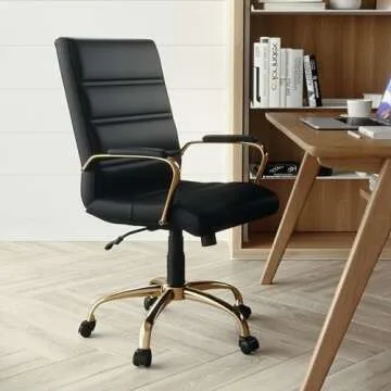 Show more The Flash Furniture Whitney Mid-Back Swivel LeatherSoft Desk Chair is the perfect addition to any modern office, home workspace, or study area. Combining style and functionality, this chair features a sleek design with a padded LeatherSoft back and seat that ensures maximum comfort even during the longest work hours. The contemporary black and gold finish gives it an elegant touch, making it not only a functional piece of furniture but also an important aesthetic element that enhances any decor. With its adjustable height feature and sturdy construction, this chair adapts to your needs while providing reliable support.