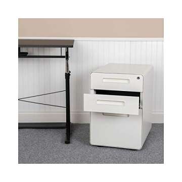 Show moreIntroducing the Flash Furniture Wren Ergonomic 3-Drawer Mobile Locking Filing Cabinet, the perfect solution for maximizing office efficiency while ensuring the security of your personal items and sensitive documents. Designed with a modern aesthetic, this filing cabinet not only fulfills functionalities but also complements the office's decor. The smooth-rolling casters allow easy mobility, which means you can position it conveniently under any desk or move it closer to your work area whenever needed. With its ergonomic design and compact dimensions of 16"W x 21"D x 24"H, it fits seamlessly into any workspace.
