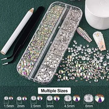 Show moreIntroducing the ultimate Flat Back Rhinestones & Pearls Kit, designed for both seasoned professionals and enthusiastic beginners alike. This complete set includes an impressive assortment of exquisite Round Glass Crystal AB and Transparent White Gems, alongside elegant White and Beige Pearls. With six sizes of sparkling rhinestones (ranging from 1.5mm to 6mm) and five sizes of lustrous pearls (from 2.5mm to 8mm), this kit provides endless creative possibilities. Whether you are enhancing your nails, applying makeup, or crafting unique decor pieces, these stunning gems will elevate your artistry and personal style.