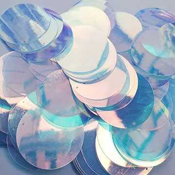 Show more Discover the enchanting world of crafting with our stunning **iridescent sequin pack**, specially designed for those who appreciate the beauty of creativity! Each sequin measures 50mm and features a magical ability to shift colors based on the light and angle, transforming your projects into vibrant displays of art. With 200 pieces per pack, you have plenty to work with for all your decorative needs.