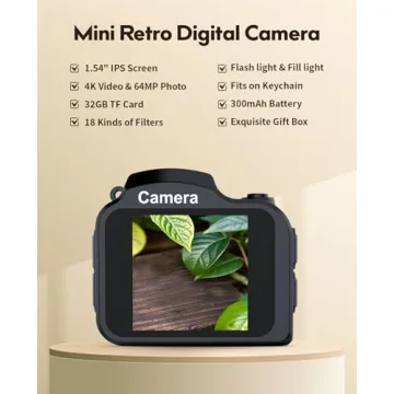 Show more Introducing the **FLATIC Mini Keychain Camera**, a pocket-sized powerhouse designed to capture life’s little moments in stunning 4K quality. Despite its compact size, this clever gadget is equipped with advanced features that make it a must-have for both budding photographers and seasoned travelers alike. The FLATIC camera not only takes breathtaking photos but also records vibrant HD videos, all while fitting comfortably on your keychain. It’s the perfect solution for anyone looking to create memories on the go, whether you are at a birthday party, on a hiking adventure, or simply enjoying a day out. Include a durable 32GB SD card and a sleek, elegant gift box, and this mini camera becomes a thoughtful gift that is sure to delight. Enjoy the convenience of reviewing your shots on the built-in screen, and don’t forget the fun filters to make your pictures even more engaging!