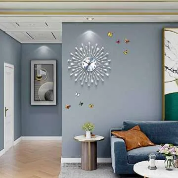 Show more Introducing a stunning addition to your home decor - our Handmade Metal Creative Wall Clock, a perfect blend of artistry and functionality. Crafted from sturdy metal and adorned with a high-temperature lacquer finish, this clock isn't just a timepiece; it's an exquisite piece of wall art. Its sophisticated design features a 1MM aluminum dial accompanied by 72 sparkling crystals that catch the light beautifully, making it a unique conversation starter in any room.