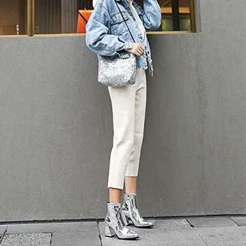 Step out in style with the Flerivva Women's Sparkle Ankle Boots, designed to bring an instant dose of sophistication and glam to your wardrobe. Crafted with a stunning chrome finish, these pointy toe booties shine bright, adding a touch of sparkle to any outfit. With a comfortable 3.3-inch chunky heel and a shaft height of 4.7 inches, they strike the perfect balance between elegance and wearability. The inside zipper closure ensures effortless on-and-off wear, while the carefully designed comfort footbed...