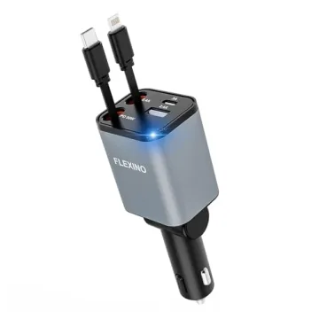 Show more Introducing the FLEXINO Retractable Car Charger, the ultimate solution for all your charging needs while on the road. Designed with space-saving in mind, this charger is 60% smaller than traditional options, offering a compact and organized charging experience. Featuring a dual retractable cord setup, it lets you reduce clutter while keeping your car interior neat during travels. You can say goodbye to tangled cables and hello to the convenience of quick charging.