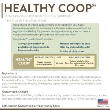 Show moreIntroducing the FlockLeader Healthy Coop, a revolutionary 12 lbs litter additive specifically designed for chicken coops. This exceptional product harnesses the power of probiotics, organic acids, and moisture absorbers to create a healthier living environment for your poultry. Proudly made in the USA, Healthy Coop goes beyond just odor control—it enhances the overall wellbeing of your flock while ensuring your coop remains safe and dry.