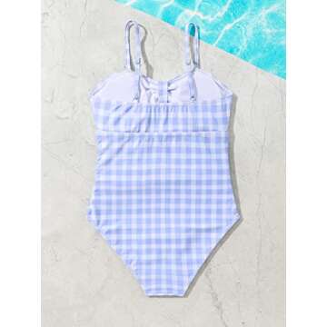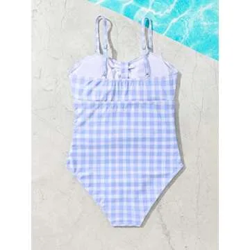 Show moreIntroducing the Floerns Girl's Gingham Print Ruched Cut Out Knot Front One Piece Swimsuit, a delightful piece perfect for young trendsetters looking to make a splash this summer! Designed with a charming blue and white gingham print, this swimsuit seamlessly blends style with comfort. The high-stretch fabric ensures a snug fit, allowing for maximum mobility whether at the beach or pool. The unique knot front detail and elegant cut-out design add a touch of sophistication, making it an ideal choice for special occasions like beach parties or family vacations. The soft spaghetti straps provide just the right amount of support without compromising on style.