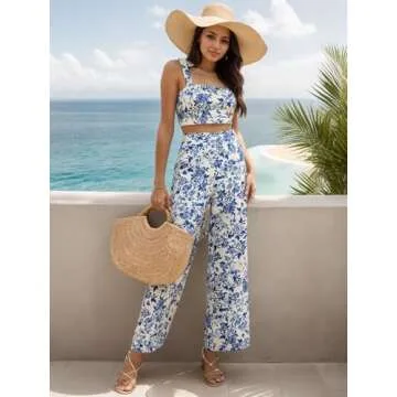 Floerns Women's 2 Piece Summer Outfit Floral Print Knot Shoulder Zip Back Crop Cami Top and Maxi Pants Set Light Multi Flower Small