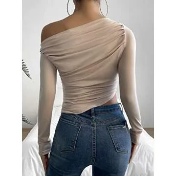 Floerns Women's Asymmetrical Neck Long Sleeve Ruched Solid Crop Top Tee Shirt Apricot L