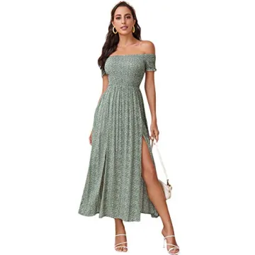 Floerns Women's Boho Floral Print Off Shoulder Split Long A-Line Dress in Green