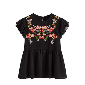 Show moreIntroducing the stunning Floerns Women's Floral Embroidered Ruffle Sleeve Peplum Blouse Top in Black, Size L! This chic and stylish peplum top is designed with comfort and elegance in mind, featuring a beautiful embroidered floral pattern that breathes life into your wardrobe. Made from a soft fabric that doesn't stretch, this top feels luxurious against your skin, making it the perfect choice for any casual outing or special occasion. Its ruffle hem and cap sleeves add a delightful flair, while the round neck ensures a flattering fit that suits a variety of body types. Whether you're dressing it up for a night out or keeping it relaxed for a day at school, this versatile peplum top is bound to become a favorite staple in your fashion repertoire.