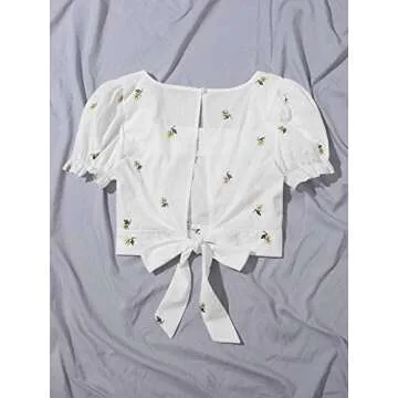 Floral embroidery, puff sleeve, short sleeve, square neck, cut out, tie back, open back, button back, frill trim, crop tops