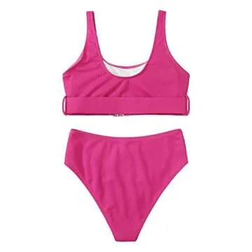 Floerns Women's High Waist Solid Bikini Buckle Front Two Piece Swimsuit Hot Pink S
