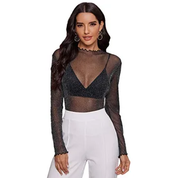 Floerns Women's Long Sleeve Slim Fit See Through Sheer Mesh Top with Sparkle Black
