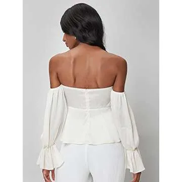 Show moreIntroducing the Floerns Women's Off Shoulder Long Sleeve Tie Front Ruched Peplum Blouse in a chic beige hue, designed for the modern woman who seeks versatility and style in her wardrobe. This exquisite blouse features a captivating knot front and delicate ruffle trim that adds a flirty touch, while the peplum silhouette flatters the figure beautifully. Made from high-quality, non-stretch fabric, it provides a structured silhouette that complements various body types. The long sleeves and off-the-shoulder design introduce an element of sophistication, making it a must-have piece for both casual outings and professional settings.