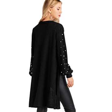 Floerns Women's Open Front Pearl Beaded Lantern Sleeve Long Cardigan - Black