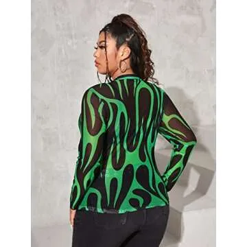 Floerns Women's Plus Size Leopard Print Mock Neck Mesh Long Sleeve Tee Shirt Top Green Black 3XL