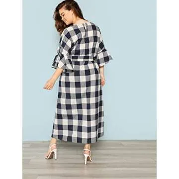 Show moreIntroducing the Floerns Women's Plus Size Plaid Tie Waist Maxi Dress, a chic and comfortable addition to your wardrobe. This stunning dress features a beautiful blue plaid pattern that is perfect for both casual and semi-formal occasions. Made with quality fabric, the dress offers a stylish appeal while ensuring you feel great all day long. Its unique tie waist design allows for adjustable fitting, enhancing your silhouette and providing support. Designed for plus-size women, this dress is available in size 3XL, catering to diverse body types with an elegant flair.