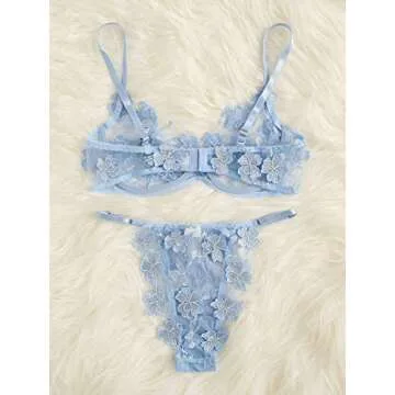 Floerns Women's Sexy Applique Lace Underwire Bra Top and Thong Lingerie Set Blue S