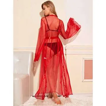 Floerns Women's Sexy Long Lace Trim Sheer Mesh Belted Kimono Robe Swimsuit Coverup Red M