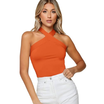 Floerns Women's Solid Criss Cross Halter Sleeveless Tee Shirt Top Orange S