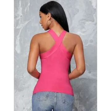 Elevate your wardrobe with the Floerns Women's Solid Criss Cross Halter Sleeveless Tee Shirt Top in stunning hot pink. This stylish top is meticulously designed with a flattering criss-cross feature and a sleek slim fit that highlights your silhouette beautifully. Crafted from high-quality fabric that has a slight stretch, it ensures not only a chic appearance but also comfort that lasts throughout your day or night out. Whether you're headed to a party, a night at the club, or a casual outing...