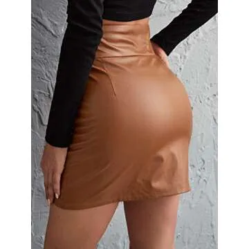 Show moreDiscover the Floerns Women's Solid High Waist Asymmetrical Hem Bodycon PU Leather Skirt, a chic addition to your wardrobe that effortlessly blends style and comfort. Crafted from a soft fabric with a slight stretch, this skirt ensures a flattering fit that hugs your curves. The classic brown color exudes sophistication, making it a versatile piece suitable for various occasions. The high waist design elongates your legs, while the distinctive asymmetrical hem adds a modern twist, making this mini skirt a crowd-pleaser for both casual outings and stylish events.