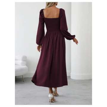 Show moreIntroducing the Floerns Women's Square Neck Lantern Long Sleeve Dress, a chic addition to every fashion-forward woman’s wardrobe. Crafted for comfort and elegance, this bodycon midi dress features a solid maroon color that is versatile and stylish. The square neckline beautifully showcases your collarbone, while the lantern long sleeves provide a hint of drama, making it perfect for any occasion. Despite its elegant appearance, the fabric offers no stretch, ensuring a structured fit that will hug your curves in all the right places. The ruched and shirred back adds a touch of sophistication, while the beautifully designed split thigh feature elevates the dress for a night out or a special event.