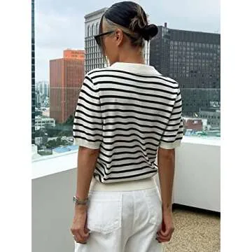 Floerns Women's Striped Print Short Sleeve Collar Neck Knitted Casual Tee Shirt Black and White S