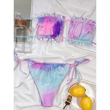 Show moreUnleash your inner beach goddess with the Floerns Women's Tie Back Ruched Bandeau with Cheeky Thong Bikini Bathing Suit. Crafted with precision and a keen eye for style, this stunning tie-dye bikini is not just a swimwear piece, it’s a statement! The bandeau top features a adjustable tie back that allows for a perfect fit, while the ruched detailing adds a touch of sophistication and flair to your beachwear collection. Made with soft, high-quality material, it embraces your curves beautifully, ensuring comfort and confidence as you soak up the sun.