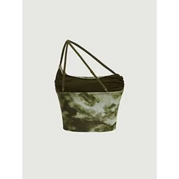 Floerns Women's Tie Dye Spaghetti Strap Cut Out One Shoulder Ruched Crop Cami Top Olive Green S