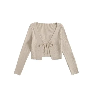 Show moreIntroducing the Floerns Women's Tie Front Long Sleeve Rib Knit Shrug Sweater, a delightful addition that effortlessly enhances your wardrobe. Crafted from a luxurious blend of soft, breathable polyester, this cute cropped cardigan is designed to offer comfort while ensuring you stay stylish. The cardigan features an elegant V neckline that beautifully frames your face and a chic open front design, providing endless styling options. Whether you choose to layer it over a summer dress or toss it on over a simple tee, this versatile piece is perfect for any occasion.