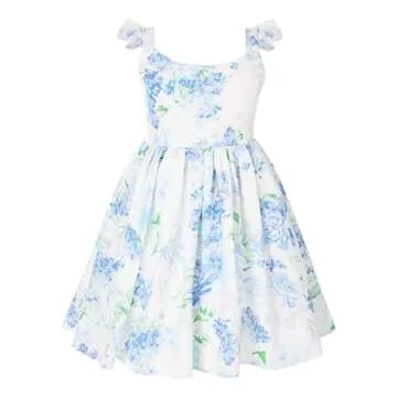 Flofallzique Floral Girls Dress Summer Casual Ruffle Sleeves Tiered Kids Vintage Sundress(4,Sea Blue)