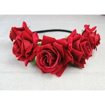 Floral Fall Rose Flower Crown Garland Festival Wedding Hair Wreaths Headbands F-32 (Red)