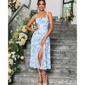 Floral Midi Corset Dress Boho Flowy Slit Lace Up Dresses for Women Going Out A Line Casual Sundress Blue