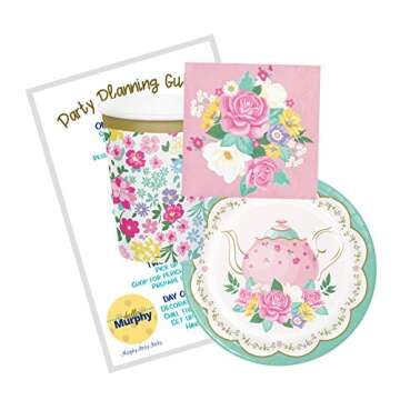 Floral Tea Party Birthday Supplies Set Plates Napkins Cups Kit for 16 Includes Party Planning Guide