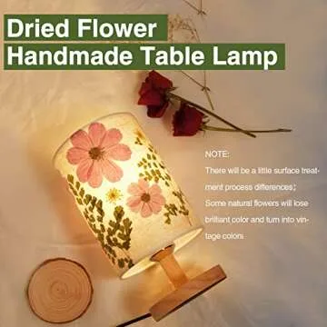 Show more Introducing the exquisite Pressed Flowers Table Lamp, a beautiful blend of artistry and functionality! This stunning lamp features vibrant, colorful dried flowers intricately arranged beneath a soft linen shade, making it an eye-catching addition to any room. The wooden base adds a touch of warmth and rustic charm to its overall design, while complemented by a lovely selection of pressed flowers that bring a piece of nature indoors.