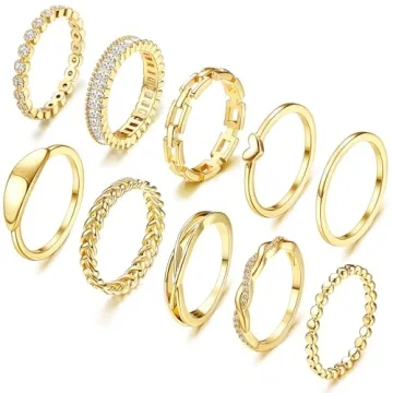 ... Show more Introducing the exquisite collection of Florideco's Dainty Gold Rings, a stunning set designed to elevate your jewelry game. Each order includes a diverse array of 10 unique stackable rings, featuring styles such as twisted rope eternity bands, chain rings, simulated diamond rings, and more. Crafted with meticulous attention to detail, these rings are lead-free, nickel-free, and hypoallergenic, ensuring they are gentle on your skin and won't cause irritation.