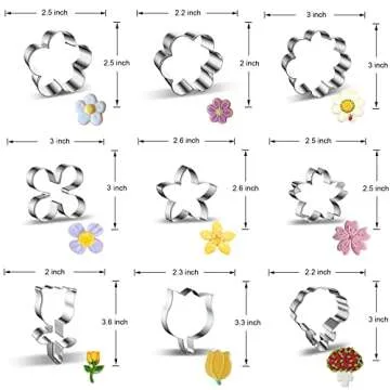 Show more Introducing the Flower Cookie Cutter Set, a charming 9-piece kit that brings a touch of blooming beauty to your baking creations. Perfectly designed to inspire creativity, this set includes an array of delightful flower shapes: from the elegant rose and exquisite cherry blossom to the vibrant tulip and graceful lilac. Each cutter is crafted to replicate nature’s artistry, providing you with the best tools to enjoy a bouquet of flowers in cookie or fruit form. Made with food-safe stainless steel, you can feel confident using these durable cutters in your kitchen without any rust worries. Their generous depth of 1 inch with curling edges guarantees a solid cut, making this kit not just beautiful, but also practical for your culinary adventures.
