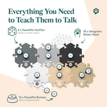 The kit includes an impressive 12 recordable buttons and 6 neutral-colored HexTile mats that provide a stylish and organized way to set up your soundboard. Each HexTile securely holds up to 6 buttons, making it easy to categorize them by commands such as 'food', 'walk', or 'play'. The included 35 ideogram stickers allow for further customization, enabling you to personalize your soundboard to fit your pet's specific needs.
