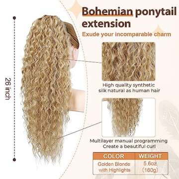 Show moreTransform your hairstyle effortlessly with the **FLUFYMOOZ Ponytail Extension**! This stunning 26-inch drawstring ponytail extension is designed specifically for women seeking a quick and chic hair solution. Crafted from high-quality, heat-resistant synthetic fibers, this hairpiece mimics the softness and texture of natural hair, ensuring that your new look feels as good as it appears. The beautiful bohemian-style curls are not only stylish but are also optimized by a French designer, making them a perfect match for any skin tone and occasion.