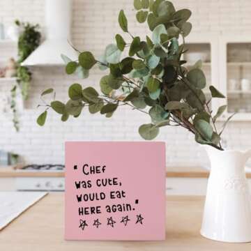 Show moreIntroducing the FLVGE Pink Kitchen Sign Decor, a delightful addition to your home that combines functionality with charm. Measuring a perfect 5x5 inches, this wooden box sign features a coffee theme and a witty phrase, "Chef was Cute Would Eat Here Again," bringing joy and positivity to your kitchen or dining area. Crafted from durable natural wood, this sign is designed to withstand the test of time while giving your decor a whimsical yet rustic touch. Its versatile nature ensures it fits seamlessly into any environment, adding a unique flair to your home.