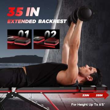 The FLYBIRD Adjustable Weight Bench with Headrest is the ultimate solution for fitness enthusiasts seeking comfort, stability, and versatility in their home gym setup. Engineered for users up to 6'5," this innovative workout bench features an improved 35-inch extended backrest for enhanced support during various exercises. With just a simple adjustment using two knobs, you can set the headrest to one of two positions, ranging from 33" to 35"—perfect for customizing your...